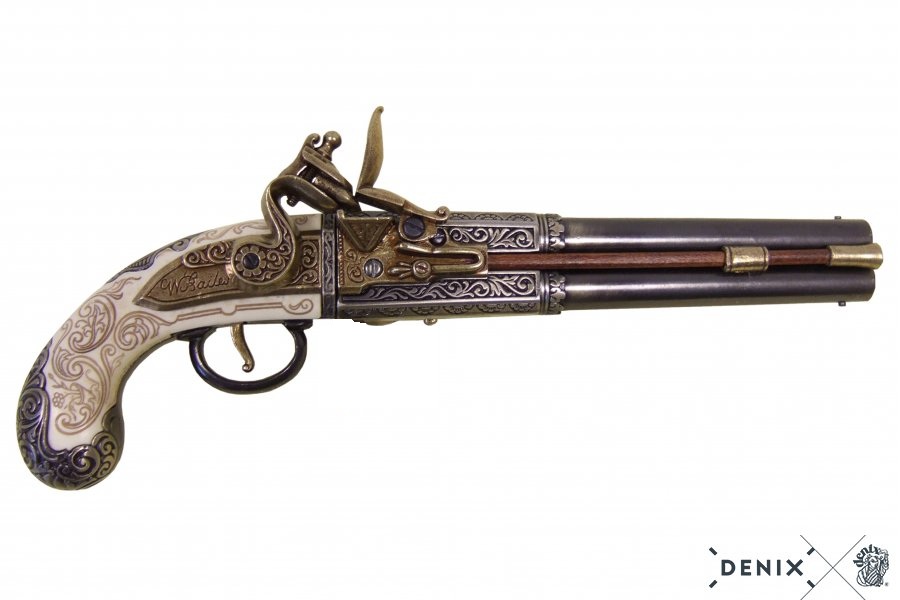 Reproducción de la pistola de chispa de 2 cañones giratorios diseñada por W. Bailes. Fabricada en metal y cachas de plástico imitación marfil, con mecanismo simulador de carga y disparo.